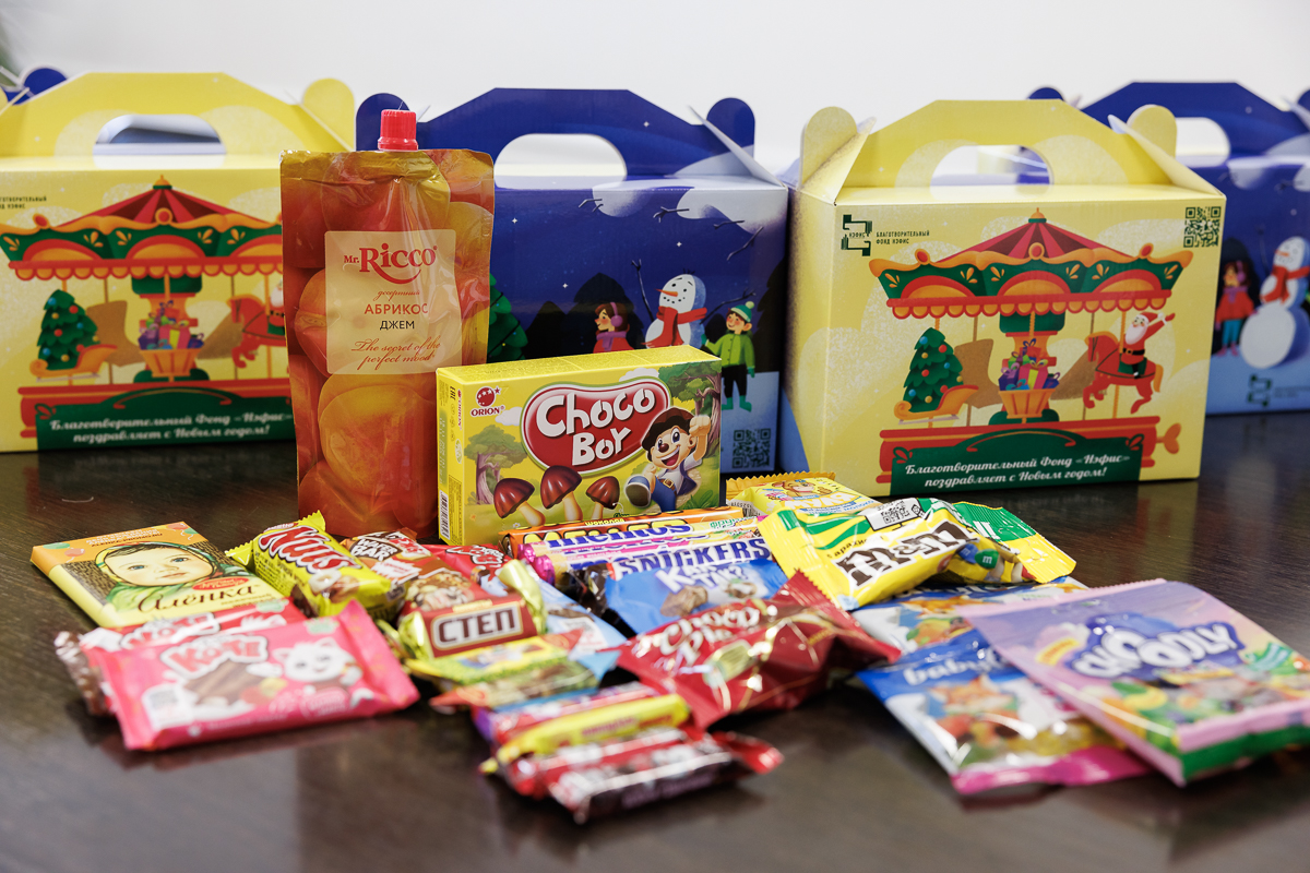 Каждый набор собран в праздничную коробку и включает конфеты, шоколад, мармелад, джем и другие сладости. Общий вес подарков от БФ «Нэфис» составляет 10,4 тонны.